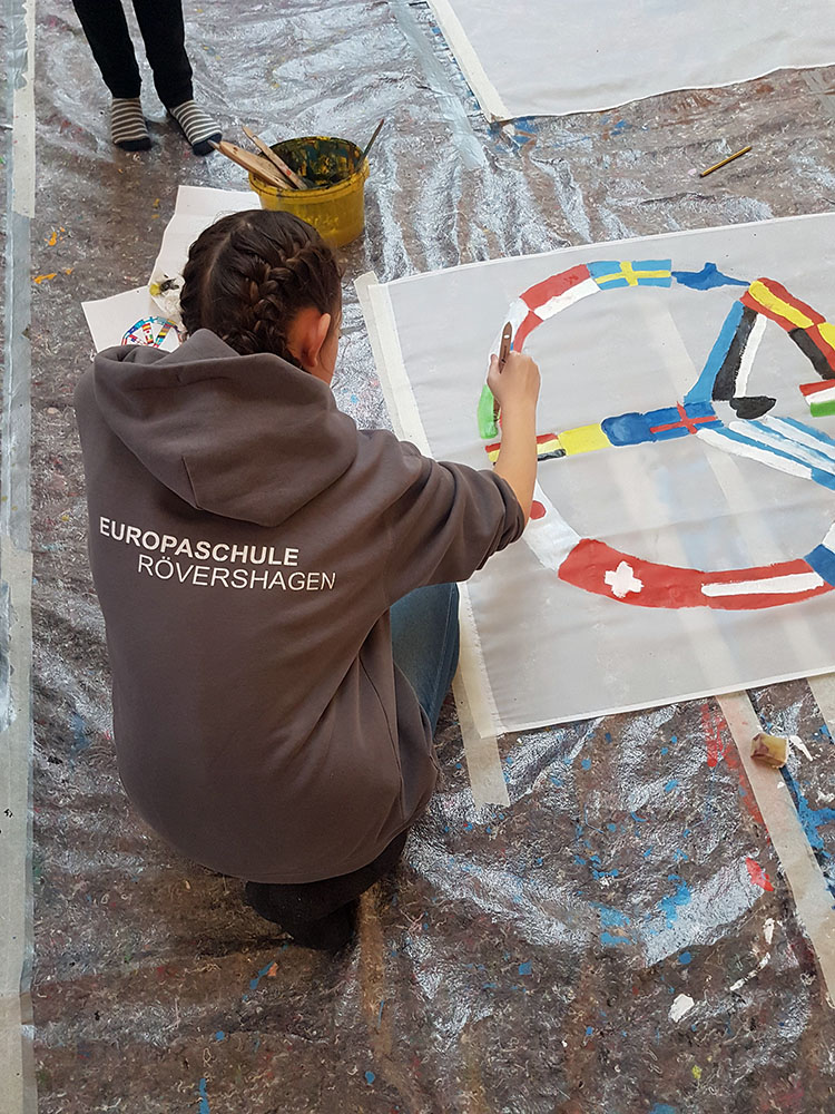 Die verschiedenen Lokations, die uns zum Malen zur Verfügung stehen, bieten Möglichkeiten zu Kooperationen und gemeinsamen Projekten. Wie Beispielsweise die Schülerworkshops vergangenes Jahr in der Kunsthalle Rostock. Die Schüler hatten die Gelegenheit, in geteilten Gruppen, sowohl ein Segel zu bemalen als dem Illustrator Andree Volkmann seine Ausstellung "fernsehen" zu betrachten und eigene kreative Ideen auf Papier zu bringen.